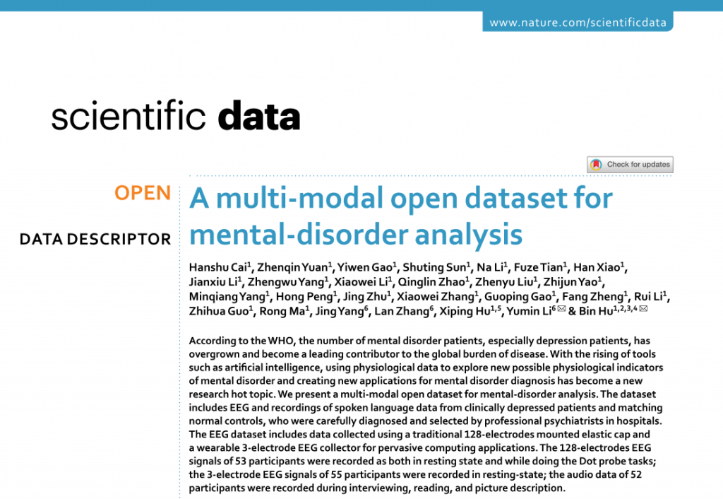Recently, the UAIS Laboratory has released a multimodal dataset for mental disorder analysis. The related research findings, titled “A multi-modal open dataset for mental-disorder analysis”, were published online in Scientific Data, a sister journal of Nature, in April 2022. Professor Bin Hu and Professor Yumin Li from the School of Medicine, Lanzhou University, served as the corresponding authors, while Associate Professor Hanshu Cai was the first author of the paper.